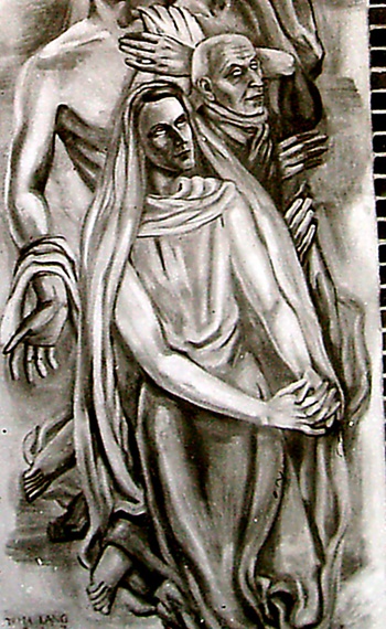 “Seit 1938 ist Irma Lang-Scheer ständig mit Fresko-Malerei und seit 1952 mit Glasfenster-Entwürfen beschäftigt. Interessant ist es, daß die Künstlerin ohne Karton direkt an die Wand arbeitet. Unter ihren zahlreichen Schöpfungen entstand in der Zeit von 1947 bis 1950 eine aufsehenerregende Apsisausmalung mit der Darstellung des “Jüngsten Gerichts“ in der Christuskirche in Rostock. Mit monumental-flammender Gewalt erscheint Christus als Weltenrichter über den Wolken, und auch die beiden Posaunenengel auf den Seiten lassen an Erhabenheit nichts fehlen. Starke Anklänge an die Malerei El Grecos werden spürbar, und dennoch kann bei der Künstlerin von persönlicher Gestaltung und eigenstarker Auffassung gesprochen werden. Dieses Werk rüttelt auf aus behaglicher Geborgenheit.....